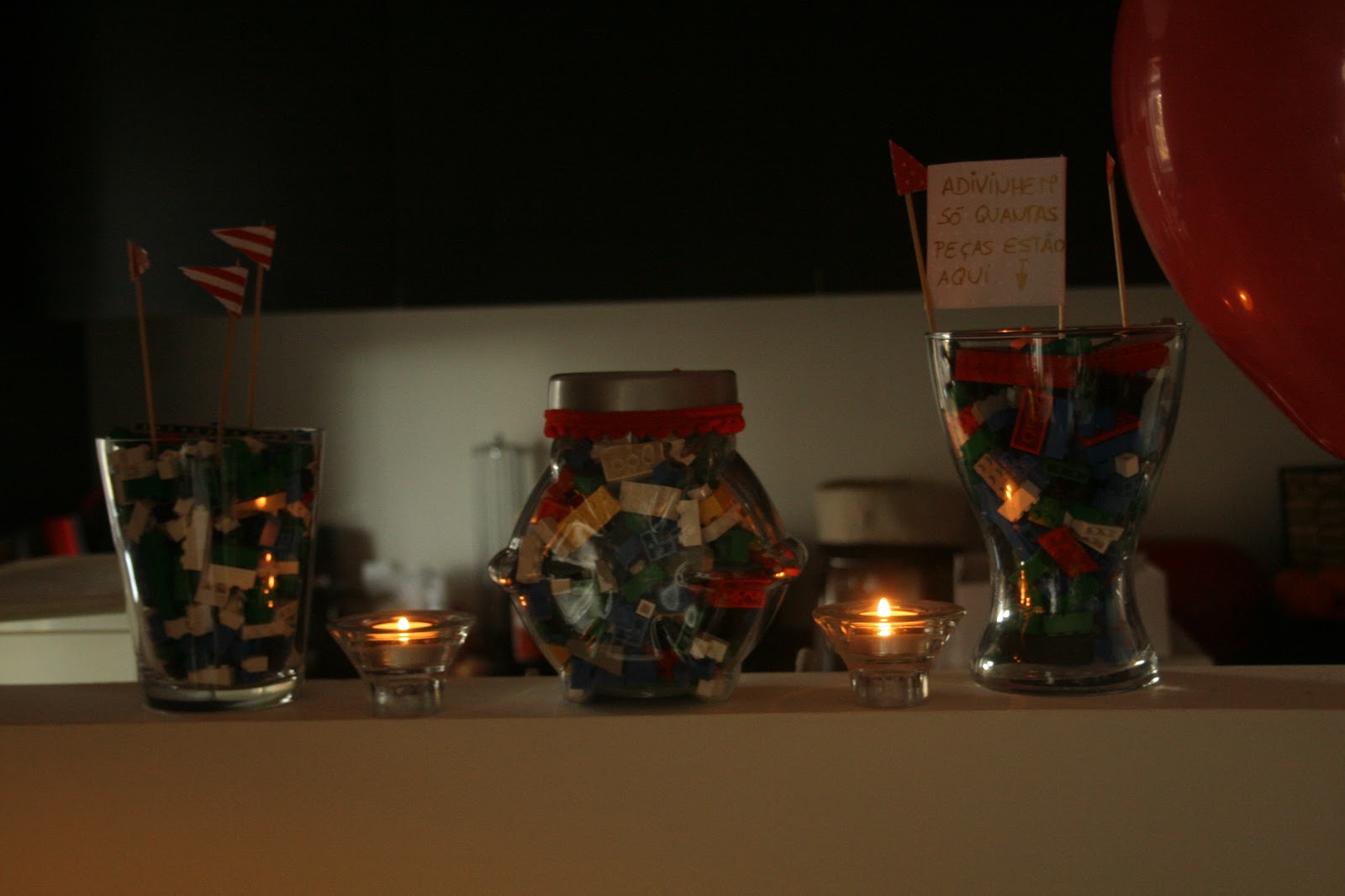 - As ideias para a decoração foram tiradas do Pinterest, como por exemplo as jarras de vidro cheias de mini peças de Lego, fica um efeito giríssimo, não ficam? E o suporte dos talheres, não ficou o máximo?